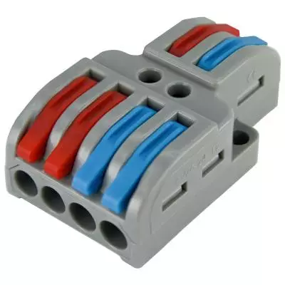 Зажим проводов в клемме осуществляется при помощи рычагов. Наличие специального паза в корпусе клеммы для размещения рычага в закрытом положении надежно предотвращает случайное отсоединение проводника. Возможно измерение электрических параметров цепи без разбора и нарушения изоляции соединения. Проводник, освобожденный от изоляции вставляется в гнездо до упора. Многожильный провод перед использованием необходимо опрессовать наконечником.